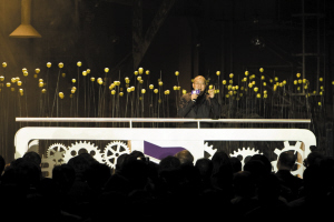 整个戏剧分光启、汇通、交响、彼岸、春之祭、洪流6个部分。负责舞台的是2008年北京奥运会开幕式的灯光设计主任肖丽河和香港影像艺术家Jeffery Shaw,在这部云戏剧里,汇集了声音、影像、音乐、诗歌、人声、身体、舞蹈、灯光装置、材料装置等多种媒介手段。巨树般的搅拌机上,还挂上了数百只苹果,营造出伊甸园的氛围。
