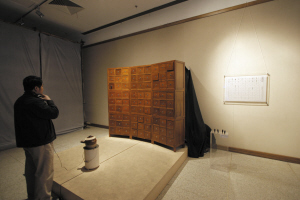 另一个油罐中放着一排柜子,每一个抽屉都是一种声音。戴上耳麦随便拉开一个抽屉、一种细微的声音顺着黑色的电线灌进耳朵。其中一个抽屉里面有一张白色卡纸,上面写着“保龄”,这个抽屉藏着的就是打保龄球的声音。每个抽屉都是一个声音采样,分为飞机、火车、人身、水、风等九组,每组则又分为九个,而几个抽屉同时拉开又会产生混音效果,一共有八十一种声音的组合方式。