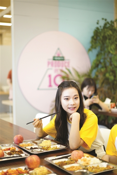 麻辣火锅、汉堡、炸鸡块 甚至辣条 这是姑娘们点的菜 趁着小姐姐们还没来食堂,我们先拉着《创造101》制片主任曹林摸了摸底。用曹林的话:“妹妹们都太不容易了,我们能让她们吃点好的,能满足她们的,就尽量满足!” 浙江广电员工食堂每周都有不同菜品,每天保证有10个菜和1道汤,有荤有素有粗粮,还有饭后水果和甜点。根据我们拿到的绝对一手内部资料,小姐姐们的伙食真是好,目测不长胖,真的挺难。 不信?我们来划划重点:土豆烧排骨、蒜苗炒腊肉、香菇菜梗肉片、糖醋里脊、毛豆蒸肉饼、千张结烧肉、香肠蒸鸡蛋、吉利炸脆排、荷香粉蒸肉、肉末烧粉皮、茶树菇爆五花、酱烧大排、笋干菜焖肉、干菜红烧肉、鹌鹑蛋烧肉圆、新疆大盘鸡、木须肉…… 另外,为了最大程度满足小姐姐的需求,节目组还在宿舍4楼放了块黑板,让姑娘们往上面写自己想吃的东西,然后节目组会酌情从中随机选择,满足她们! 于是乎,据说小姐姐们在黑板上写的菜有:麻辣火锅、汉堡和炸鸡块、奶油蛋糕,甚至辣条和薯片…… 对于这些“无理”的要求,节目组当然不会满足啦。不过他们却提供了下午茶,除了枣夹核桃、混合坚果,竟然还有蛋挞,这家伙同样很胖啊。 你的拉链还拉得上吗? 这是取餐处立的牌子 小姐姐们面对美食诱惑该怎么办?节目组说了,全凭两个字:克!制! 因为每餐都是自助形式,所以节目组在取餐处立了一个牌子,上面写着: 你的拉链还拉得上吗? 要不要低头看看你的小肚子? 这个拉链梗是怎么回事?据说,小姐姐们第一次公演时穿的服装,是提前一个月测量大小的,结果经过一个月美食的诱惑,有人胖了12斤,有人腰围粗了5厘米,临正式演出时发现,衣服拉链都拉不上了! 我们被逗得哈哈笑时,小姐姐们终于来吃饭了,定睛一看,都是人气选手。 山支大哥孟美岐、甜妹子吴宣仪、小可爱赖美云、萌萌哒杨超越、美丽的紫宁,还有“人气王”王菊。 问她们觉得伙食如何?6位小姐姐异口同声:“超级好!”