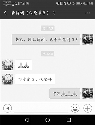 昨天下午,当香港媒体爆料称“金庸30日在香港逝世”后,快报记者何晨向金庸之子查传倜求证,得到对方的答复:“下午走了,很安详!”(手机对话截图) 有杭州书迷连夜赶去书店 珍藏一套金庸武侠小说 赶到杭州庆春路购书中心的时候是昨天晚上8点40分,离书店关门还有20分钟,但是书店2楼的电梯口处,金庸的武侠经典展柜已经悄悄摆好了。 展牌上写着:“飞雪连天射白鹿,笑书神侠倚碧鸳”,这是以金庸的14部武侠小说的名字的第一个字所作的一副对联。很多人用这句话形容金庸的一生。中间黑色加粗的字体则是:再见,金庸。 “觉得太可惜了,想把他的书都珍藏起来。”家住庆春路附近的吴先生,在网上刷到了金庸先生逝世的消息,趁着书店还没关门,拉着女朋友直奔购书中心二楼,花了1968元买了金庸武侠的全套小说。“我最喜欢看《笑傲江湖》,大学里在图书馆借来看,家里也有几本。”和金庸先生一样,吴先生最爱的小说男主角也是令狐冲,说起“独孤九剑”的招式,还像模像样地用双手摆起了一个比武的架势。“为什么爱看武侠小说?”“每个男生都有一个武侠梦吧!”吴先生说完抱着一箱书下了电梯。 30岁的薛先生爱读小说,虽然不是金庸书迷,但金庸先生的15部小说都看过。“为什么喜欢金庸的书?”“他用白话写出了古典的味道。”听闻金庸先生去世的消息,薛先生感到非常意外,连问了两遍:“这是真的吗?”直到最后离开书店,他始终有些难以置信。 |