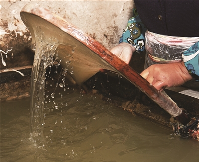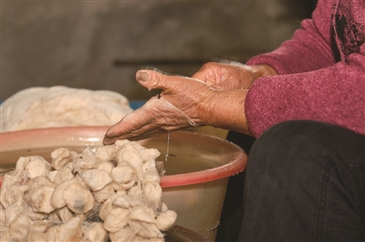 彩根阿姨和老伴俞大伯每天4点就起来工作,俞大伯负责选茧、煮茧。蚕茧在旺火下咕嘟咕嘟煮两个小时,除去蚕丝外层的丝胶。丝胶除得愈净,丝绵质量愈好。 之后的工作,就都是彩根阿姨她们的了。做“小兜”“大兜”都需要把手浸在水里操作,冬天寒冷,夏天皮肤容易泡烂,非常辛苦。 在场的每位阿姨、奶奶都有50年以上的制作丝绵的经验,她们两只手上下翻飞,好似武林高手,一只蚕茧变成“小兜”只要几秒钟。速度之快,相机拍出来都是残影。 因为早饭吃得早,每天上午10点,阿姨们会烧一些点心垫垫肚子,通常是番薯。这也是她们放松的时候,会停下来聊聊天,讲讲笑话。