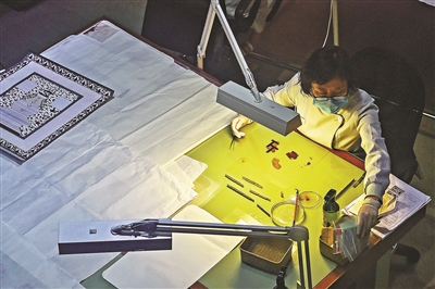 “我们在前期分析检测的基础上,对文物进行消毒、清洗、平整等保护处理,再结合每件文物的实际保存状况,设计修复方法,包括局部背衬加固、整体背衬加固以及表面覆绉丝纱等方式实施针线法修复,使文物得以全面妥善保护的同时,提升了可看性。”