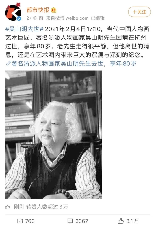 都市快报报道 2021年2月4日17点10分,当代中国画重要领军人、著名浙派人物画家吴山明先生因病在杭州逝世,享年80岁。