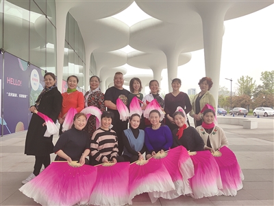 在临平公园见到他的时候,他正举着粉红的桃花扇和一群阿姨翩翩起舞,跳的是红歌《江山》,“谋幸福,送温暖,日夜不忘老百姓,康宁团圆……”安哥表情丰富,情绪饱满,舞蹈动作熟练,中间还有一段挑大梁的双人舞,只见几个旋转跳跃,一个200多斤的胖子跳出了轻盈的感觉。