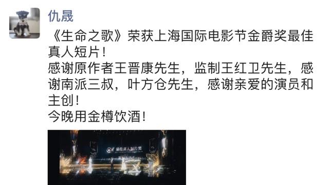 获奖后,仇晟很是开心,在朋友圈里不仅感谢了出品方和原作者、主创,还表示,“今晚用金樽饮酒”。相较于《郊区的鸟》以对记忆的梭巡来构建故事,在《生命之歌》中则开始探究科技的本质与生命的本源。