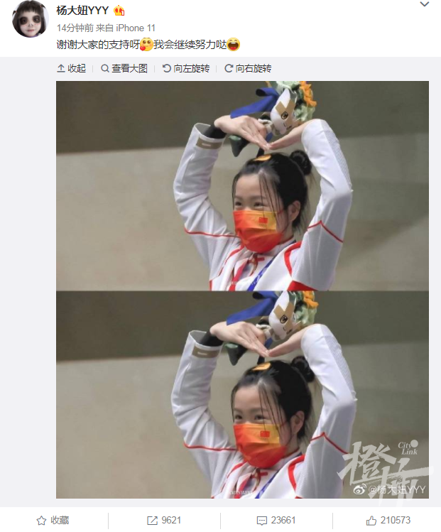刚刚,杨倩也在个人微博上晒了自己的比心照合集,“谢谢大家的支持,我会继续努力哒”。