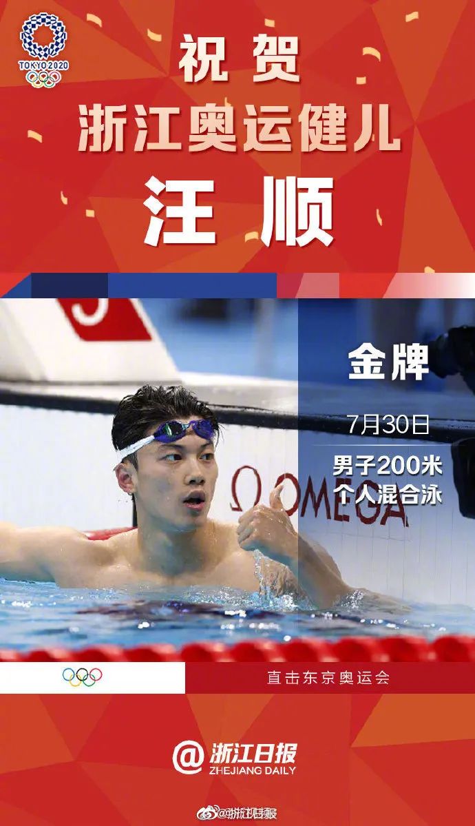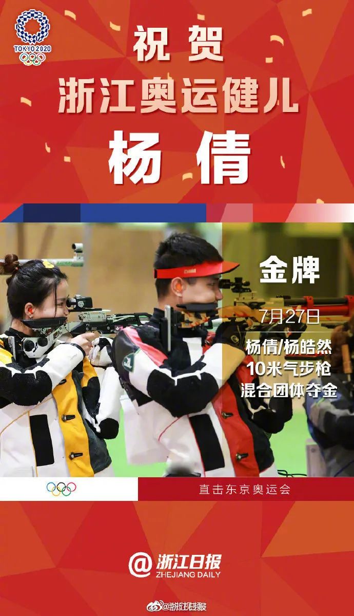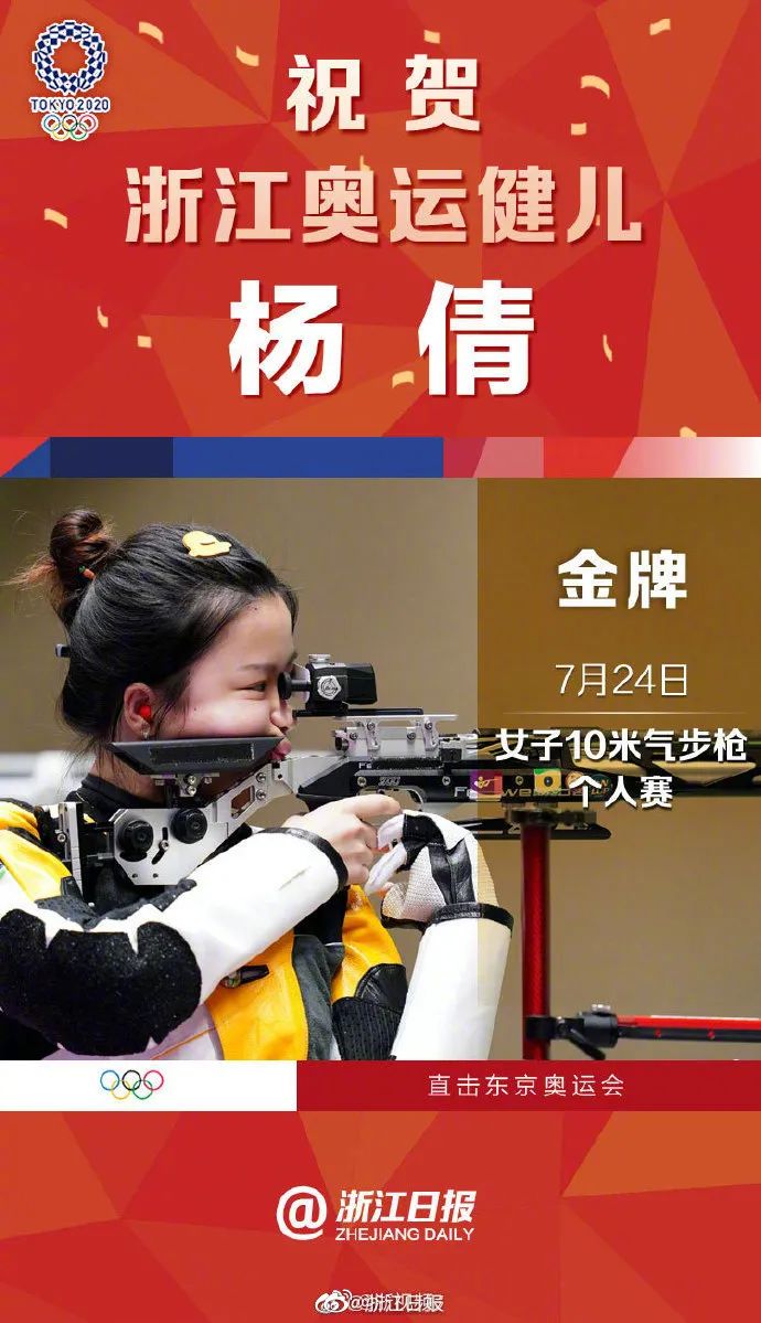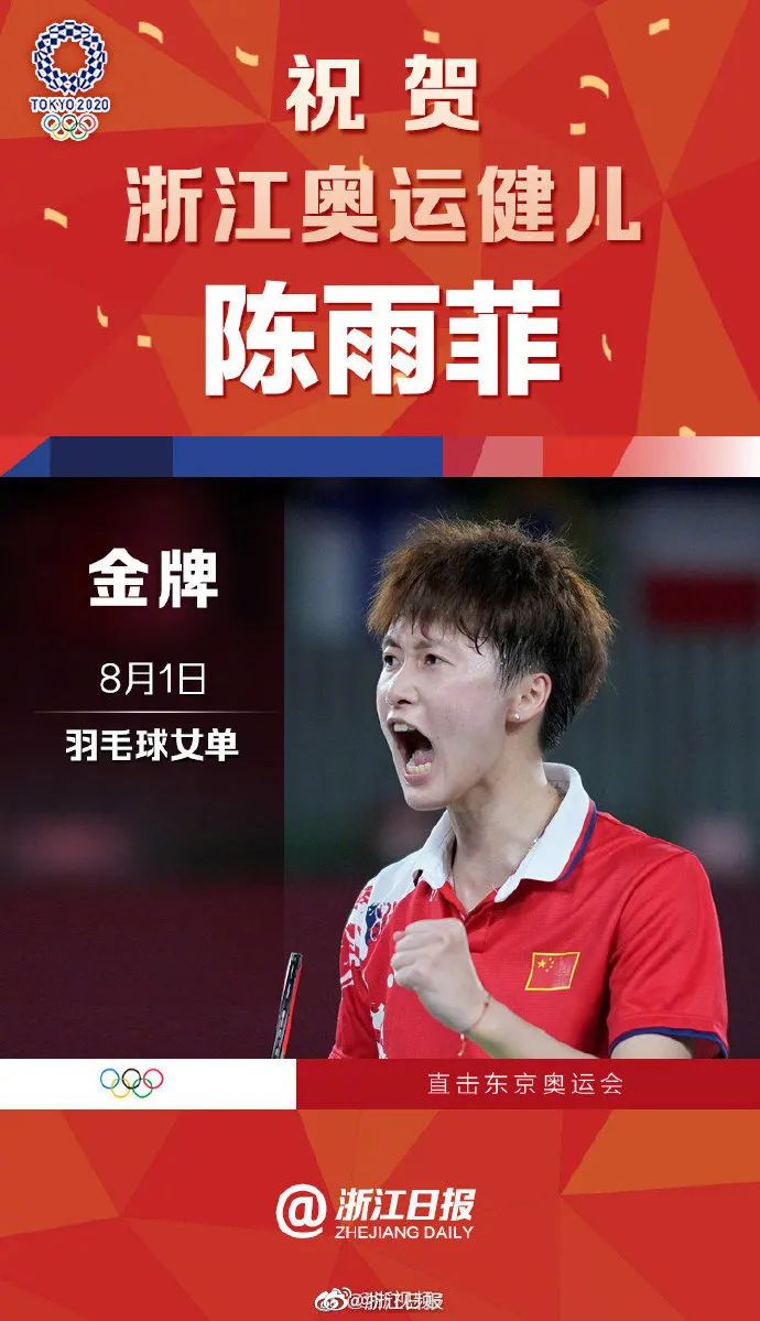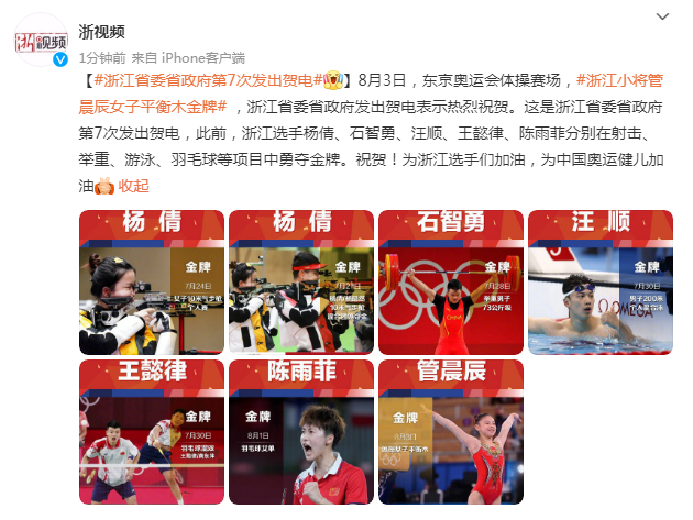 这是浙江省委省政府第7次发出贺电,此前,浙江选手杨倩、石智勇、汪顺、王懿律、陈雨菲分别在射击、举重、游泳、羽毛球等项目中勇夺金牌。
