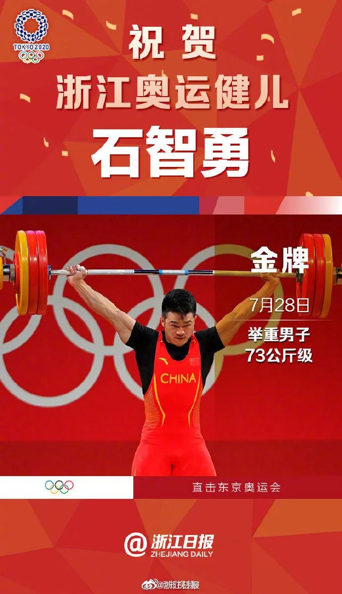 7月28日晚,中国举重运动员石智勇以抓举166公斤,挺举198公斤,总成绩364公斤获得东京奥运会男子举重73公斤级冠军,并打破总成绩世界纪录!