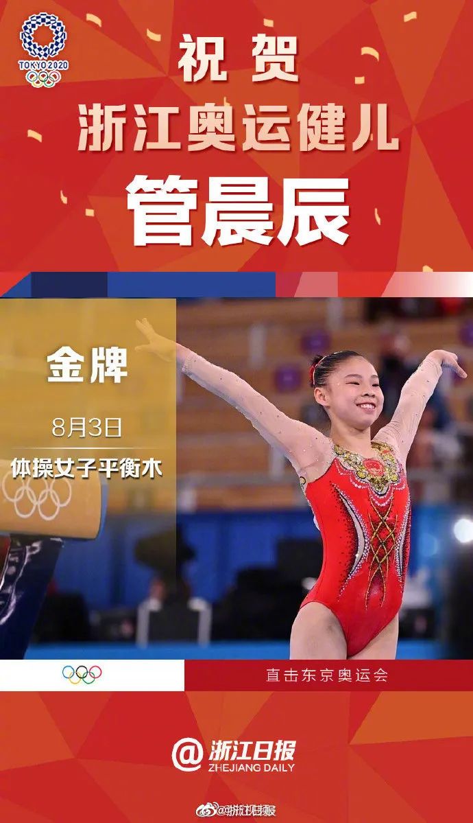 杭州日报综合 8月3日,东京奥运会体操赛场,浙江小将管晨辰女子平衡木金牌,浙江省委省政府发出贺电表示热烈祝贺。