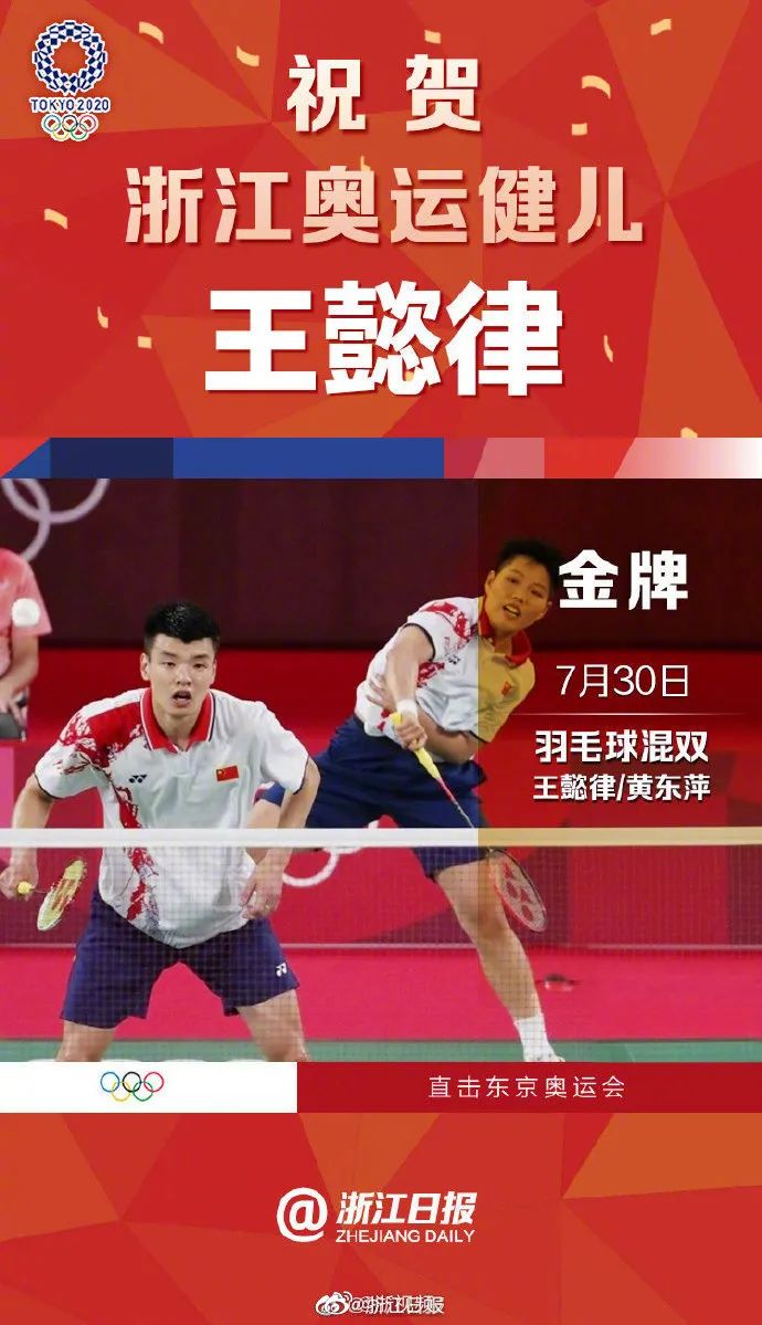 2021年7月30日,在东京奥运会羽毛球混合双打决赛中,王懿律、黄东萍以21:17、17:21、21:19苦战三局,总比分2:1战胜队友郑思维、黄雅琼夺得金牌。