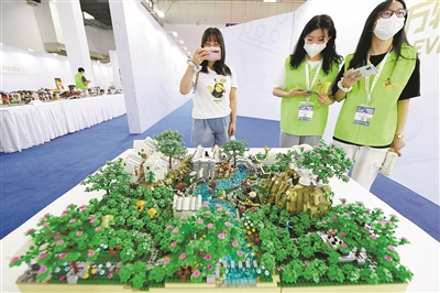 在A馆2楼的《万物可创:无边界的颗粒艺术》展,其中一大亮点便是《西湖沙盘》,通过颗粒艺术“定制”西湖印象,杭州人熟悉的市民中心、洲际酒店、雷峰塔、来福士等标志性建筑栩栩如生。据展位负责人郑晛介绍,该沙盘通过参照西湖实景艺术加工而成,占地面积10.5平方米,用砖量18万,历时半个月由10人共同创作完成。