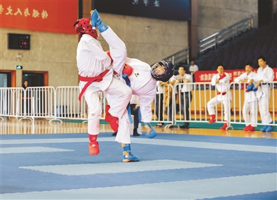 张宇超(蓝色腰带)在空手道对抗交流赛中
