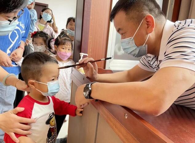 “端午节,点雄黄;画个王,驱百病,保安康”,在余杭区仓前街道文化礼堂门口,各村书记为每一位到场的小朋友点雄黄。这是我们端午节传统习俗之一,寓意借着老虎之威,以镇百虫。