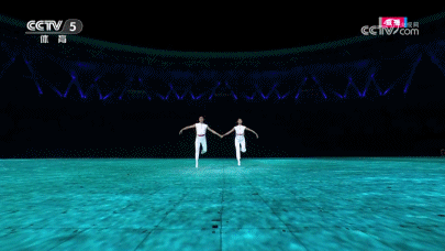 这是双3D威亚技术首次应用于大型运动场空间中,立体飞旋于空中的男女演员,与地屏的钱塘江浪潮即时互动,在这个节目里,冲天潮将从地屏冲到悬空的网幕,实现人与潮、力与美的双向奔赴。