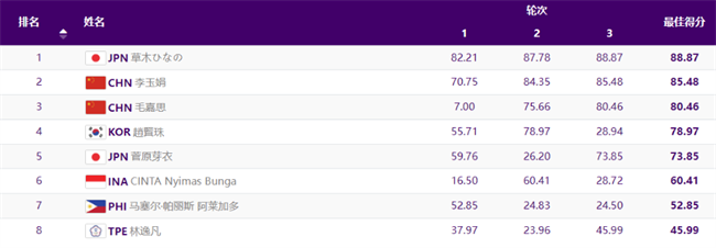 此前,在昨天(24日)进行女子碗池预赛中,中国选手毛嘉思77.06分,排名第二,另一名中国选手李玉娟排名第六。