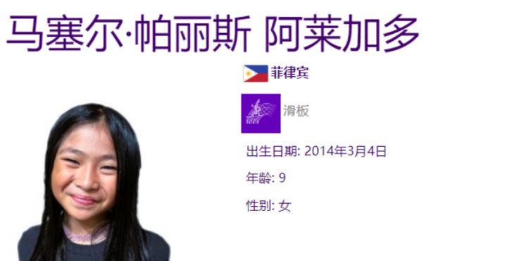 其中,年龄最小的菲律宾选手马塞尔•帕丽斯•阿莱加多,出生于2014年3月4日,今年才9岁,她是今天参赛年龄最小的选手,也是本次杭州亚运会年龄较小的选手之一。