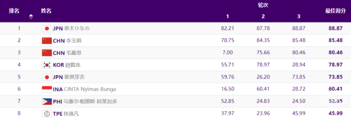 此前,在昨天(24日)进行女子碗池预赛中,中国选手毛嘉思77.06分,排名第二,另一名中国选手李玉娟排名第六。