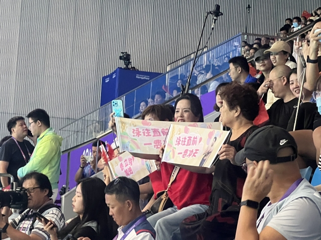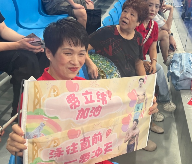 费妈妈说,家门口作战有这么多热情的观众为儿子加油,相信他可以的。她还用心准备了很多加油手幅,上面写着寓意美好的“一费冲天”。