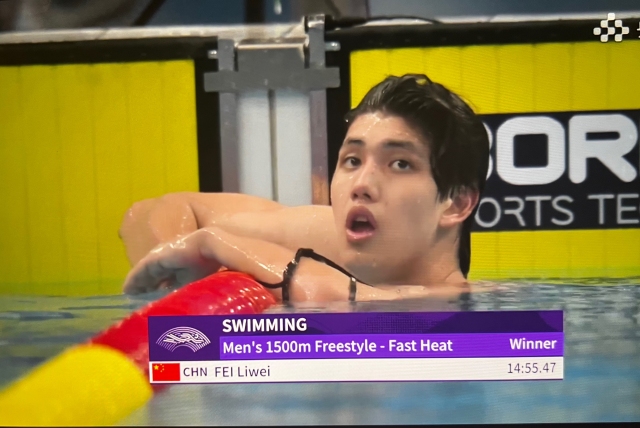 今年5月的全国游泳冠军赛,也是在这块亚运会场地,费立纬在1500米自由泳决赛中再破15分大关,以14分46秒59的成绩夺冠。