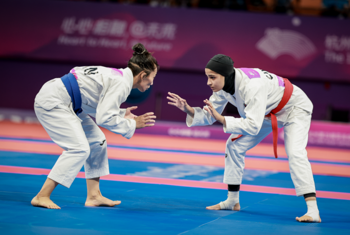 10月6日,亚运会柔术女子52公斤级决赛举行。中国队选手苗婕(左)与阿联酋队选手ALHOSANI Asma在比赛中。亚组委 供图