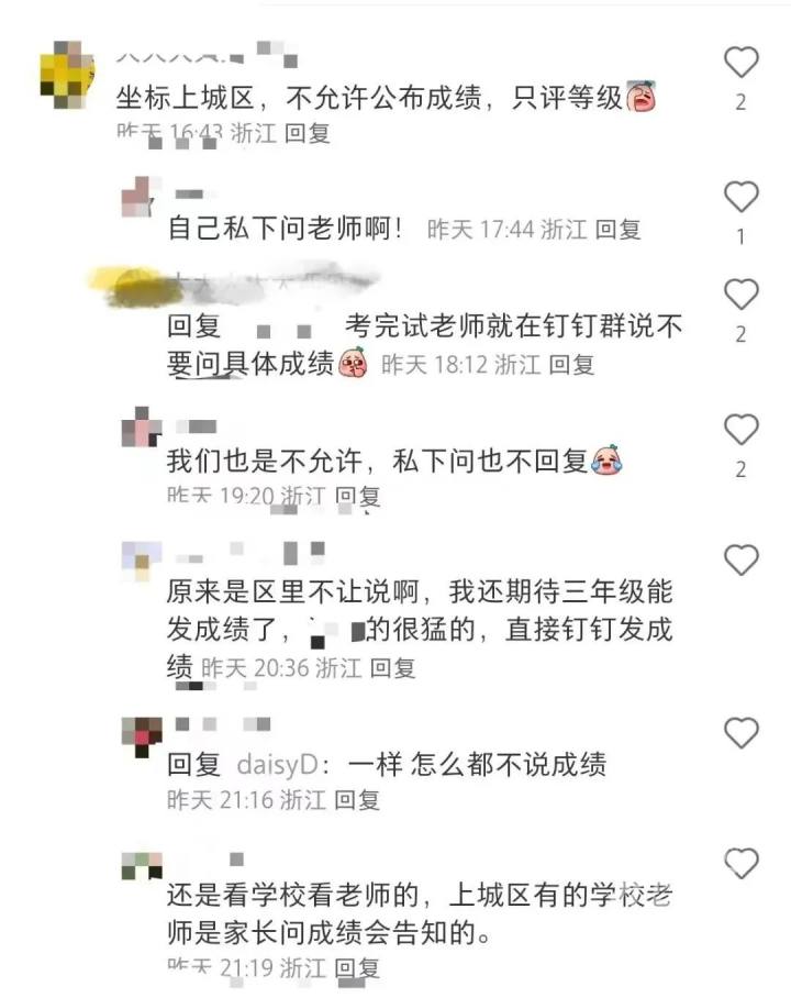 一位上城区家长在网上分享:“学校老师说不允许公布成绩,只评等级。老师还在钉钉群说不要私下问具体成绩。”