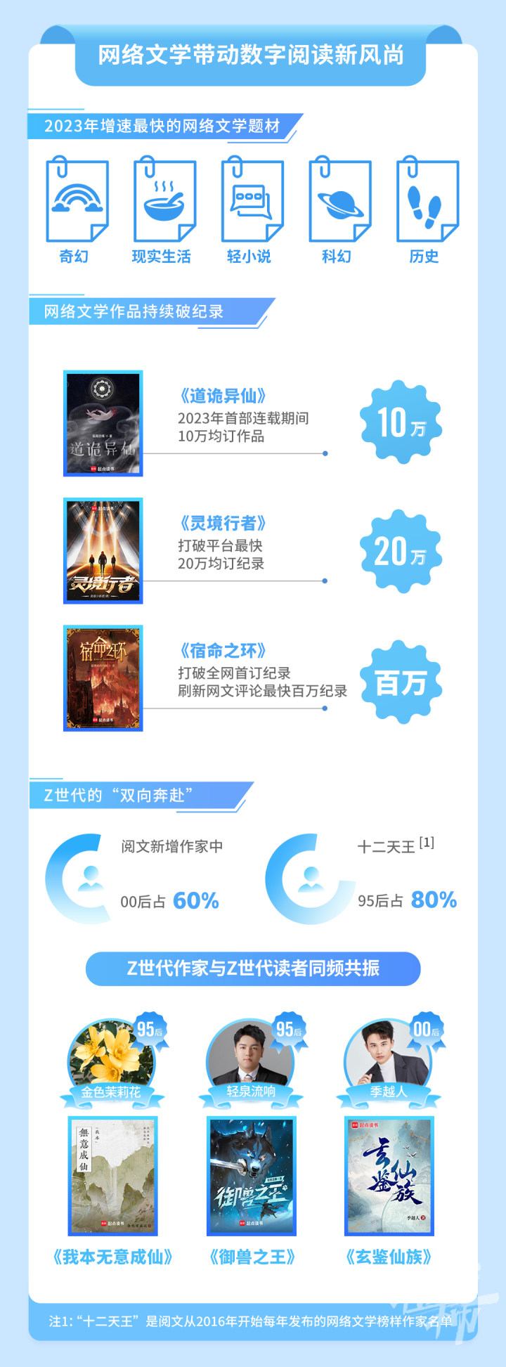 2023年,奇幻、现实生活、轻小说、科幻、历史是阅文平台增速最快的前五大网络文学题材,受到年轻用户的广泛喜爱,优秀作品不断刷新各项纪录。如《道诡异仙》是2023年首部连载期间达成10万均订的作品,后登顶中国小说学会年度中国好小说网络文学榜首,以新颖奇幻的东方美学“圈粉”了上千万年轻读者。