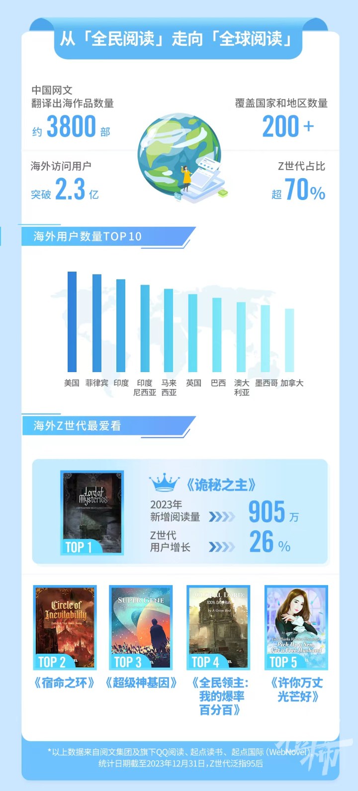 《诡秘之主》《宿命之环》《超级神基因》《全民领主:我的爆率百分百》《许你万丈光芒好》是2023年海外Z世代用户最喜欢的中国网文作品,对应西方奇幻、玄幻、游戏竞技、都市言情等不同题材类型,反映出网文出海作品的多元格局。通过丰富的故事情节和深刻的人文思考,中国网络文学正在让海外年轻人更加深入地了解和感知中国的历史和文化。