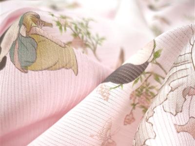“水织法”还有一个秘诀,其实就是对蚕丝表面的丝胶蛋白进行处理。新鲜蚕丝周围包裹着一层黏稠的胶状物质,需要脱胶。先将蚕丝放入清水之中,加入适量酸性溶液后煮沸,再将煮过的蚕丝捞出,放入清水缸中脱胶,这样一来,不仅去除了蚕丝上附着的油脂和杂质,蚕丝纤维也变得更加松散、有弹性。蚕丝保持半脱胶的状态,这样,织出来的杭罗面料,舒适柔韧又能长期保存。