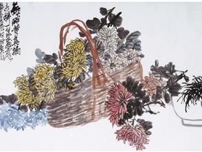 西泠印社首任社长吴昌硕的两幅“篮菊菖蒲图”,便是这种文化意蕴的生动写照。在“篮菊菖蒲图”(横幅轴)中,吴昌硕以书入画,将篮中菊花与盆中菖蒲融为一体。菊花或黄或白,更有大胆的西洋红点缀,恰似隐逸高士的多彩心境;菖蒲则以墨色勾勒,叶片如剑,散发着清冷孤傲之气。两者相映成趣,既有“采菊东篱”的闲适,又含“清泉白石”的风骨;而另一幅“篮菊菖蒲图”(横幅),吴昌硕以浓墨重彩彰显出菖蒲的雄浑生命力。画面中,菊花的烂漫与菖蒲的坚韧相互映衬,看似随意的布局,实则暗含文人“耐苦寒、安淡泊”的精神追求,每一处笔触都流淌着对生活的热爱与对气节的坚守。