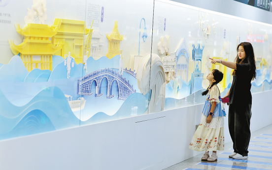 记者来到地铁5号线大运河站,虽然是工作日的下午,但站内人流量依然不小。走进站厅,首先映入眼帘的是20米长的纸雕,如画卷徐徐展开,古代、近代、新中国成立后以及当代四个时期的拱宸桥畔风情一窗呈现,搭建起一座连接过去与未来的桥梁。运河之上,浙江展览馆、拱宸桥、香积寺、小河公园、望宸阁等地标性建筑依次展现,市井烟火与人文荟萃交织,让我们得以领略大运河水脉的奔腾绵延,见证拱墅城区的跃迁发展。