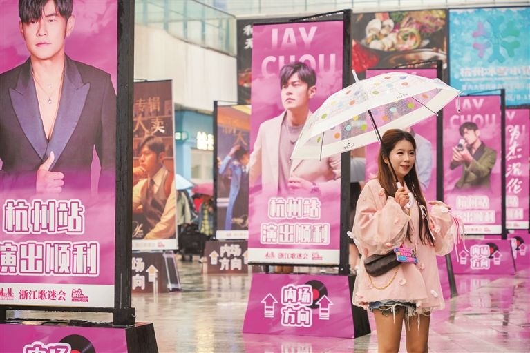 昨天傍晚,虽然细雨绵绵,但紧邻奥体中心的莲荷里商场中庭,热情的歌迷在精心布置的周杰伦应援打卡区热情拍照。当晚周杰伦“烟花杭州·嘉年华Ⅱ”2026世界巡回演唱会在奥体中心体育场唱响。4月3日至5日,周杰伦会在这里连开3场演唱会,这也是周杰伦发售新专辑后首场演唱会。