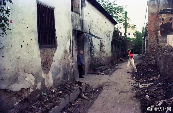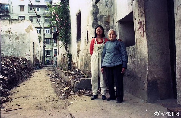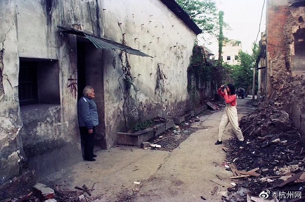 1998年,也是一个蔷薇花盛开的4月,杭州城东河畔的海狮沟正在拆迁。章胜贤见一位女孩正在给奶奶拍照留念,即为她们祖孙拍了几帧照片,等冲洗扩印彩照再送去时,海狮沟那里已是人去楼空,不知她们去哪里过渡了?
