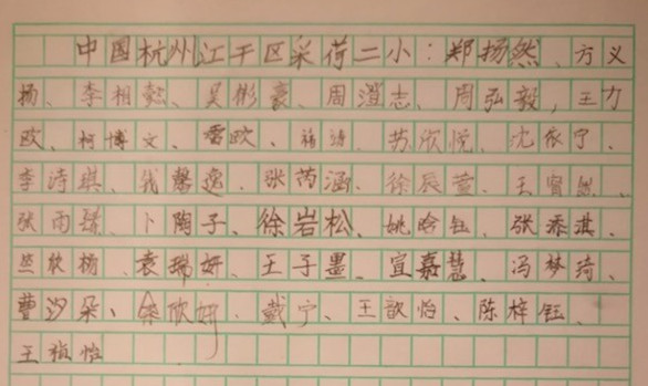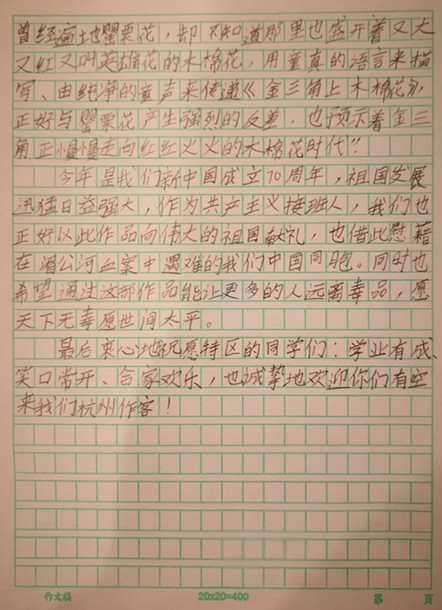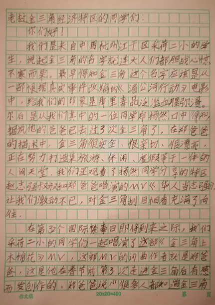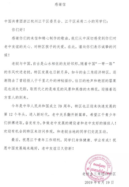 拍摄那天,杭城突下暴雨,从下午四点半一直拍摄到晚上九点,孩子们不但不叫苦,还被歌词和音乐所打动,专门给特区的同学们录制了一段邀请视频,并联合署名写了一封信,而且立即得到了特区的热烈回应,特区发来了回信、互动视频。