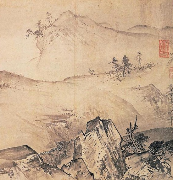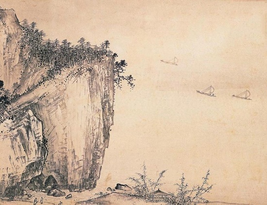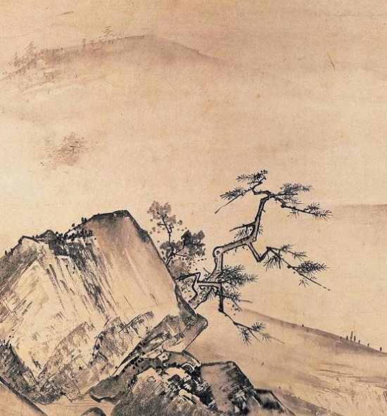 而大量留白之后,突然出现一棵用浓黑墨色画的苍松。从枝干上的洞来看,这棵松树被砍过一刀,反而更顽强地往水平方向延伸,构成一种马夏画派常见的“拖枝画法”。