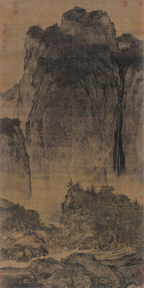 类似的浓墨与留白对比还有多处,篇幅有长有短,每每令人惊喜。 尤其是这里,一段超大量的留白之后,突然出现如此垂直的悬崖。留白之中并非全然虚无、而有三艘扬帆之船,悬崖之下流水、游人等细节也足够丰富。 最挠人心痒痒的是,夏珪还提供了一处最佳观赏地——下面的一座小亭子,高山,流水,尽收眼底。得此一亭,夫复何求?