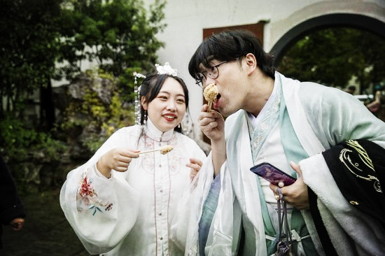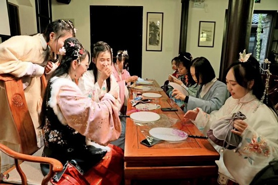 部分身穿汉服的姑娘在方志馆参加了“亲近刺绣,感受非遗”活动。江浙一带是养蚕产丝的地方,丝织业自古发达,所以刺绣技艺驰名中外。