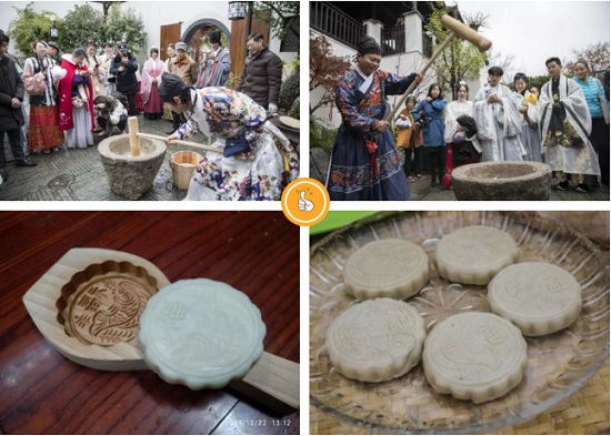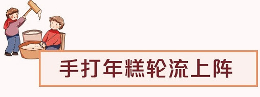 据钟毓龙《说杭州》记载,农历十一月最重者为冬至,杭州人有“冬至大如年”之说。过去,到了冬至前后,村里家家户户就开始打年糕了。水烧热,然后在木桶里放上水磨粉,开始蒸。水磨粉蒸熟之后,被倒进一旁的石臼。打年糕是个力气活,稍微打一会儿就会出汗,方志馆的游客们轮流上阵体验。捶打几下,洒点水,再把米粉团翻个身,反复捶打数百次,年糕就打好了。 打好的年糕蹭亮蹭亮的,放到铺了塑料纸的门板上。只需要一根长线,年糕就被切成了一个个年糕头。今年方志馆制作的年糕,加印了一个方志馆设计的LOGO——“伍公糕”,以缅怀这位为国为民的先贤。