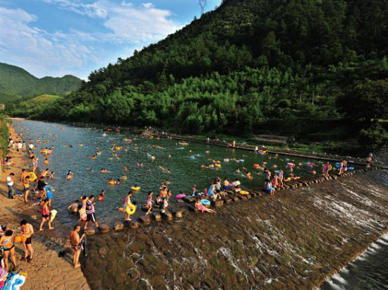 2012年以来,根据芦茨溪的特色定位,通过生态堰坝截流蓄水,形成多个天然泳池,可游泳水域面积达到6万平方米,2014年作为杭州的代表,成功申报了全省第一条全域可游泳的河道。 相关新闻: 论一条可游泳河流的“自我修养”