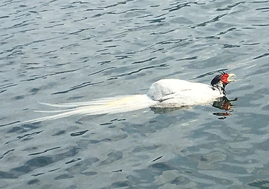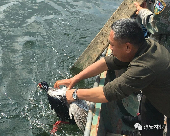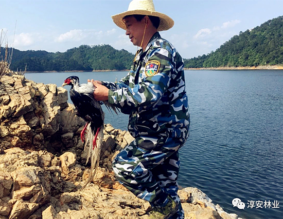 日前,淳安县许源林场职工在林区作业返回途中,发现一只落入千岛湖的白鹇。