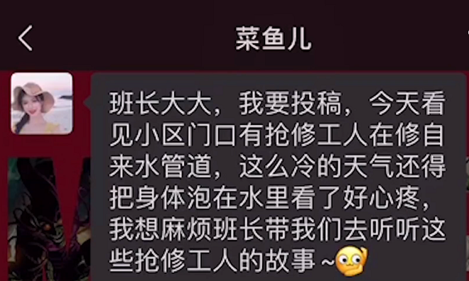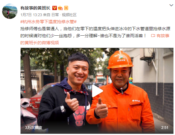 1月7日,自媒体“有故事的黄班长”在微博上传了一条视频:#杭州水务零下温度抢修水管# ,视频中“黄班长”采访了一位在寒冬只穿一件单衣钻进冷水里抢修水管的“光头师傅”。