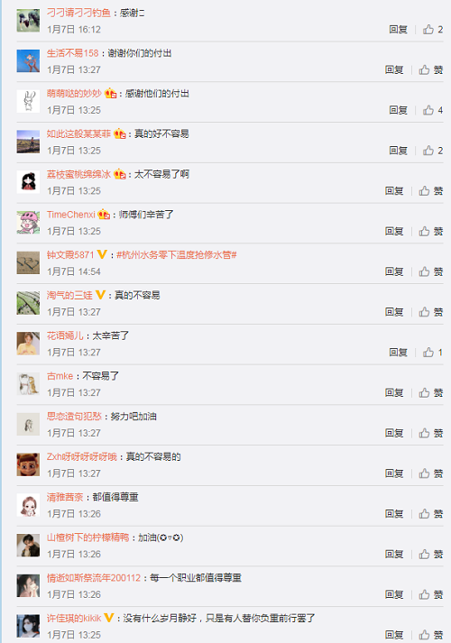 在这条微博下,有不少网友感动留言:“向他们致敬”,“每一个职业都值得尊重”“感谢他们的付出”