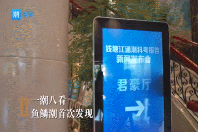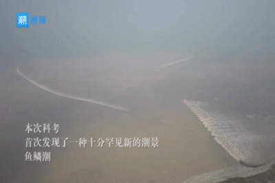 钱塘江涌潮以前通常出现一线潮、交叉潮、回头潮、兜潮、二度潮、对撞潮、波纹潮,本次科考除对撞潮没观测到外,但在南岸上虞东进闸以西发现了新的潮景——鱼鳞潮,而且潮水行进速度最快可达10-11米/秒,大于海宁段涌潮行进速度。