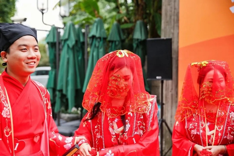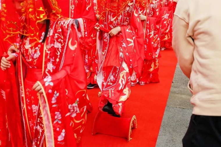 11位新娘也同样身着宋式服装,顶着红盖头,在拜别父母后,随着催妆仪式与新郎携手一同前往位于叭蜡子巷的小广场参加婚礼仪式。