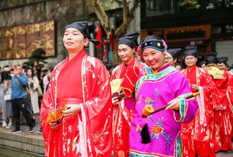 本次活动既高度还原了南宋时期结婚场景,也饱含了杭州年轻人追求简约浪漫和爱情忠贞的婚恋价值观。有了这场别开生面的宋式婚礼,南宋御街顿时成为了欢乐喜庆的海洋。