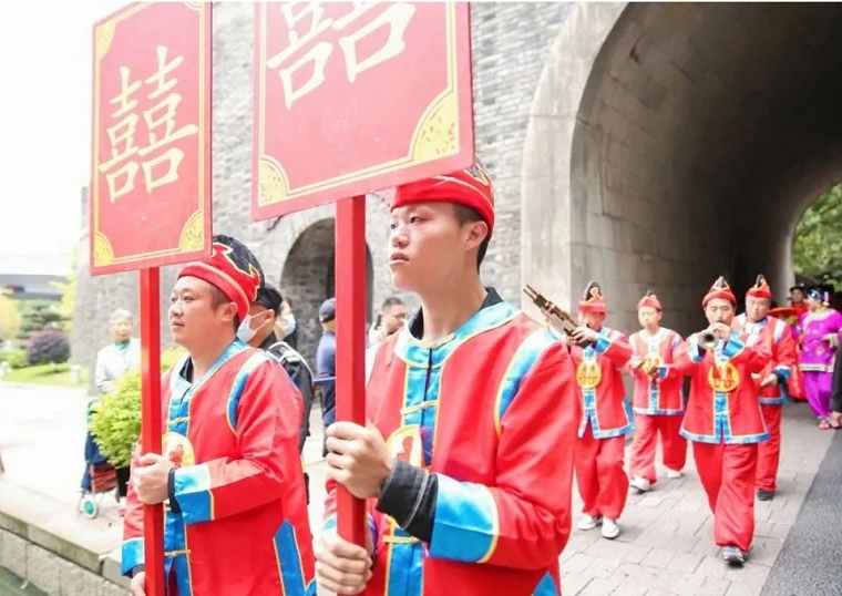活动首先以新郎迎亲开场。11个新郎身着南宋时期的服装,在媒婆、吹鼓手、随从的陪伴下,从鼓楼城墙门外敲锣打鼓,来到位于南宋记忆城市书房前的“娘家”迎接新娘。