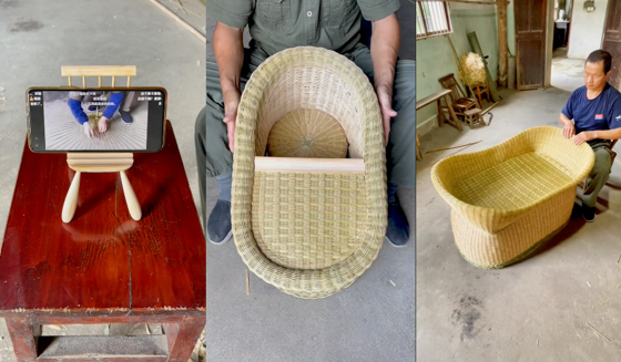 借助短视频平台,这些竹编视频在海外走红,成为网友们了解中国文化的窗口。相比这些,潘云峰更感兴趣的是,如何改良传统竹编技艺。他根据现代人的习惯,用竹子制作了手机架、儿童座椅、婴儿床、颈椎枕等新产品。