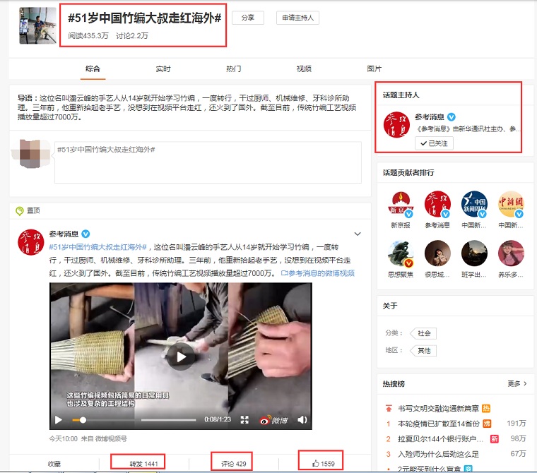 10月29日, #51岁中国竹编大叔走红海外# 的话题登上了新浪微博热搜榜单,阅读量高达435.3万。视频的主人公是70后的竹编师傅潘云峰,他坦言,“没想到,竹编手艺这项传统手工艺,也会受到当下中外年轻朋友们的喜爱。”
