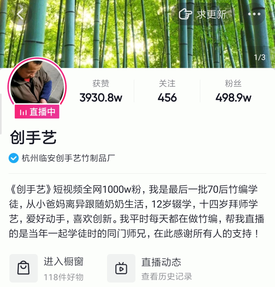 潘云峰在抖音和今日头条等平台注册了账号,名为@创手艺。刚开始的时候他不太懂拍摄,也不知道应该拍什么,粉丝寥寥。