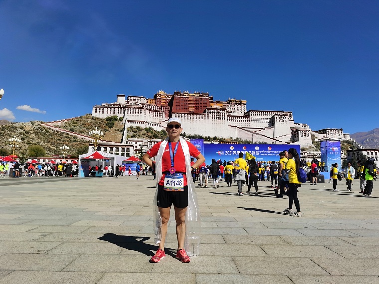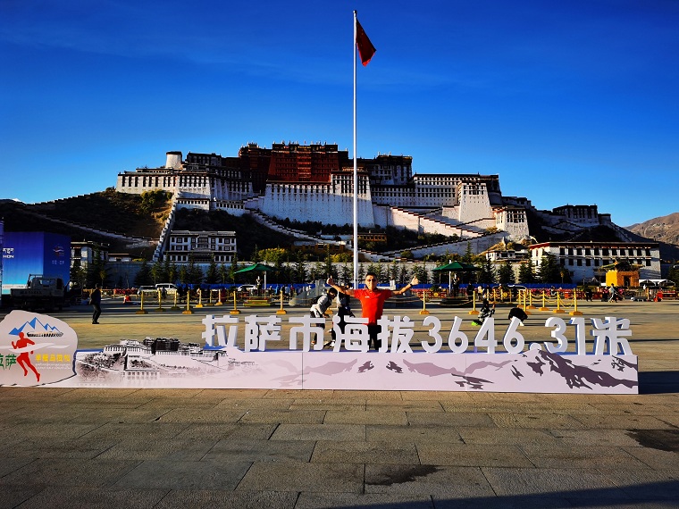 冲过终点,没有鲜花,也没有欢呼声,但相信我那一刻的脸上荡漾着笑脸,就如绽放的高原“格桑花”。穿着盛装的美丽的藏族姑娘款款而来,为我披上了洁白的哈达,挂上了一枚富有西藏特色的“格桑花”完赛奖牌。我就在布达拉宫(也是西藏和平解放70周年纪念大会广场)见证下,完成了“天下第一高”的拉萨半程马拉松。