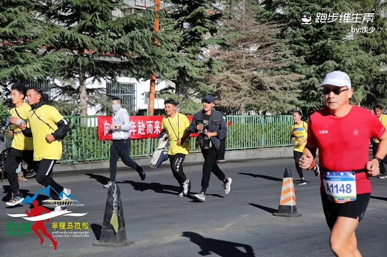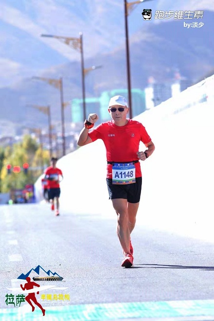 随着人潮,刚刚起步的阿季、阿蔡就将我扔下了,等我反应过来,他们俩已在200米开外。从后面赶上来的一群群学生和一批批选手也快速从我身边跑过。我真羡慕他们渐离渐远的背影,我真想像他们一样奔跑起来,但自身的感受告诉我,我不能跟队,也没有能力跟队,这两条腿,注铅似的,不管怎么努力,就是沉甸甸的,迈不开,1公里后,感觉口干气喘,脚步越来越重,根本没办法按原来计划好的6分配速跑。此时,看见一些跑友在拿氧气瓶,边吸边跑,我也很想去拿氧气瓶(每个补给点都有),但很快打消了念头。我担心一旦开始吸氧,不但影响配速,还可能成为依赖。于是,重新定位自己,再放慢速度,从630配速调整到700配速,当时心里只有一个念想,就是不能停下奔跑的脚步,要一步一个脚印,踏实了再向前。就这样,每一步都在煎熬中迈开,每一步都在奋进中死撑。